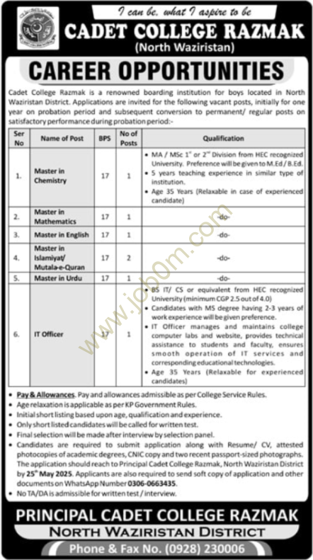 Tagged as: Cadet College Razmak, Cadet College Razmak Jobs 2025, government jobs, government jobs 2025, govt jobs 2025, jobs near me, latest govt jobs, new govt jobs, new jobs 2025, Today new jobs