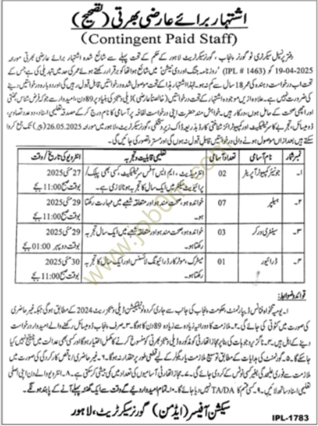 The Governor Secretariat Lahore is offering many job positions in 2025. These are full-time government jobs that are safe, stable, and respected. The jobs are for people with different education levels, from Middle pass to Intermediate. If you have studied up to 8th grade, 10th grade (Matric), or 12th grade (Intermediate), you can apply.